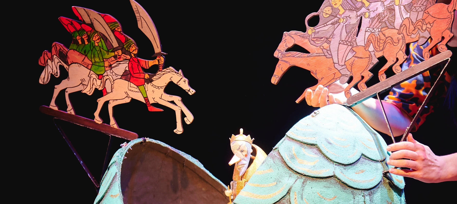 В этом спектакле всё настоящее: замечательная сказка А. С. Пушкина, где каждое слово на вес золота, живая музыка и искренность артистов. На сцене два исполнителя: актриса-рассказчица, управляющая всеми куклами, и музыкант, играющий на девяти необычных музыкальных инструментах. Артисты словно вышивают узоры этой удивительной истории. А зрители, попадая в атмосферу уютной камерности и театральной магии, с удовольствием рассказывают вместе с артистами любимую сказку.