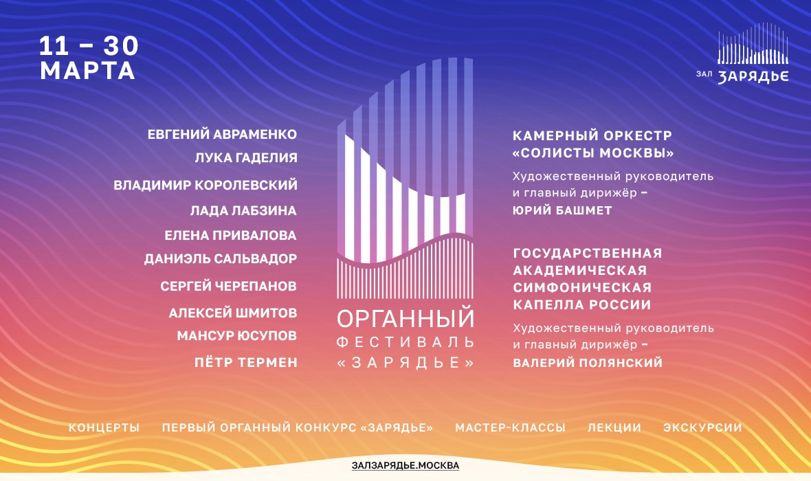 С 11 по 30 марта в Зале Зарядье пройдёт органный фестиваль. Лучшие органисты соберутся в Москве сыграть на одном из самых больших органов Европы в зале с уникальной акустикой.